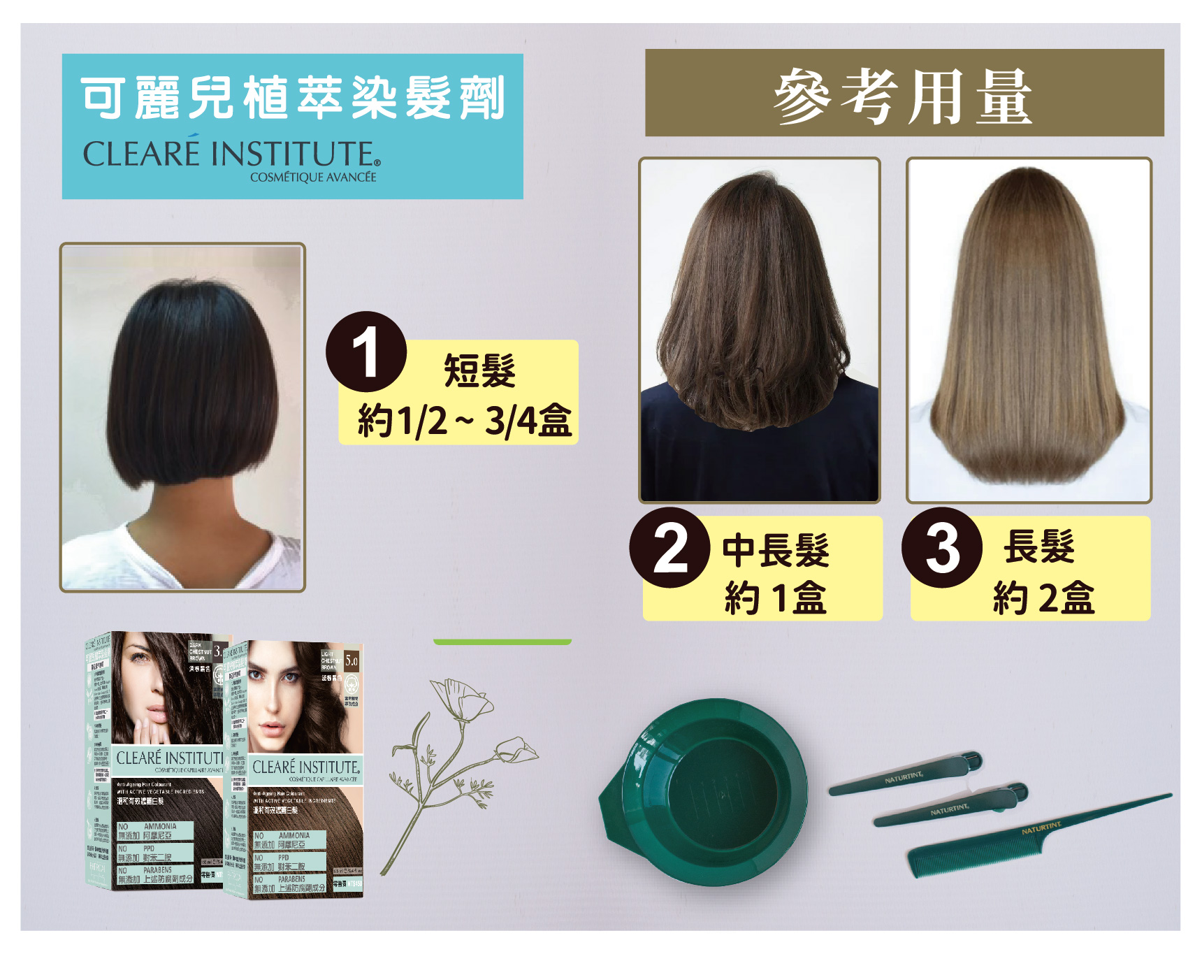 短髮: 約1/2盒 ~ 3/4盒